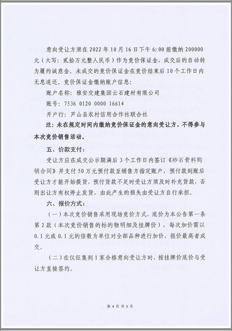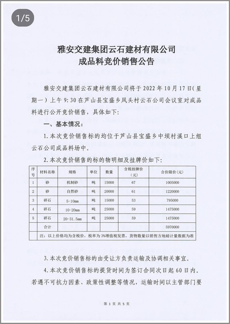 雅安交建集團(tuán)云石建材公司成品料競(jìng)價(jià)銷售公告10.13