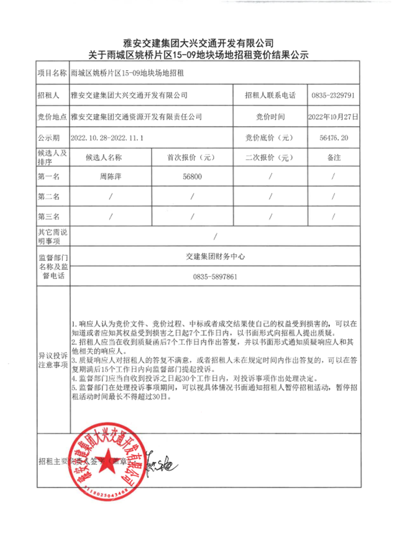 雅安交建集團大興交通開發(fā)有限責(zé)任公司關(guān)于雨城區(qū)姚橋片區(qū)15-09地塊場地招租競價結(jié)果公示