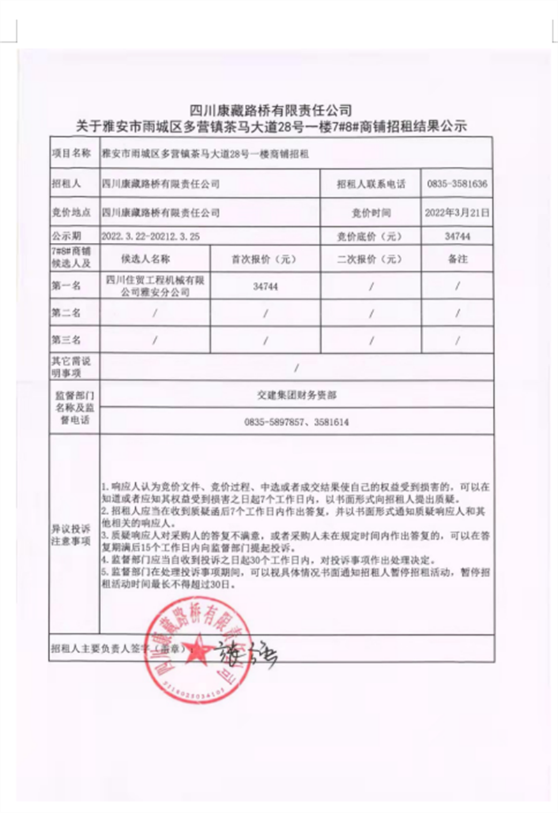 四川康藏路橋有限責(zé)任公司關(guān)于雅安市雨城區(qū)多營鎮(zhèn)茶馬大道28號一樓7#8#商鋪招租結(jié)果公示