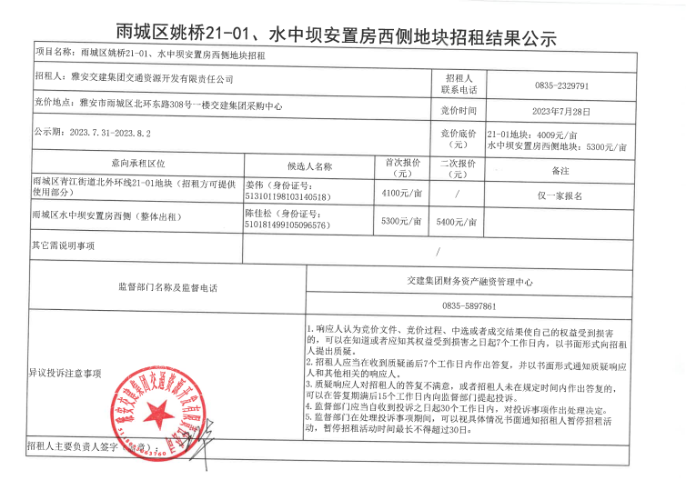雅安交建集團(tuán)交通資源開發(fā)有限責(zé)任公司關(guān)于雅安市雨城區(qū)姚橋21-01和水中壩塊塊招租結(jié)果公示