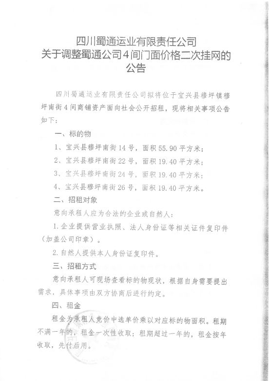 四川蜀通運(yùn)業(yè)有限責(zé)任公司關(guān)于調(diào)整蜀通公司4間門(mén)面價(jià)格二次掛網(wǎng)的公告