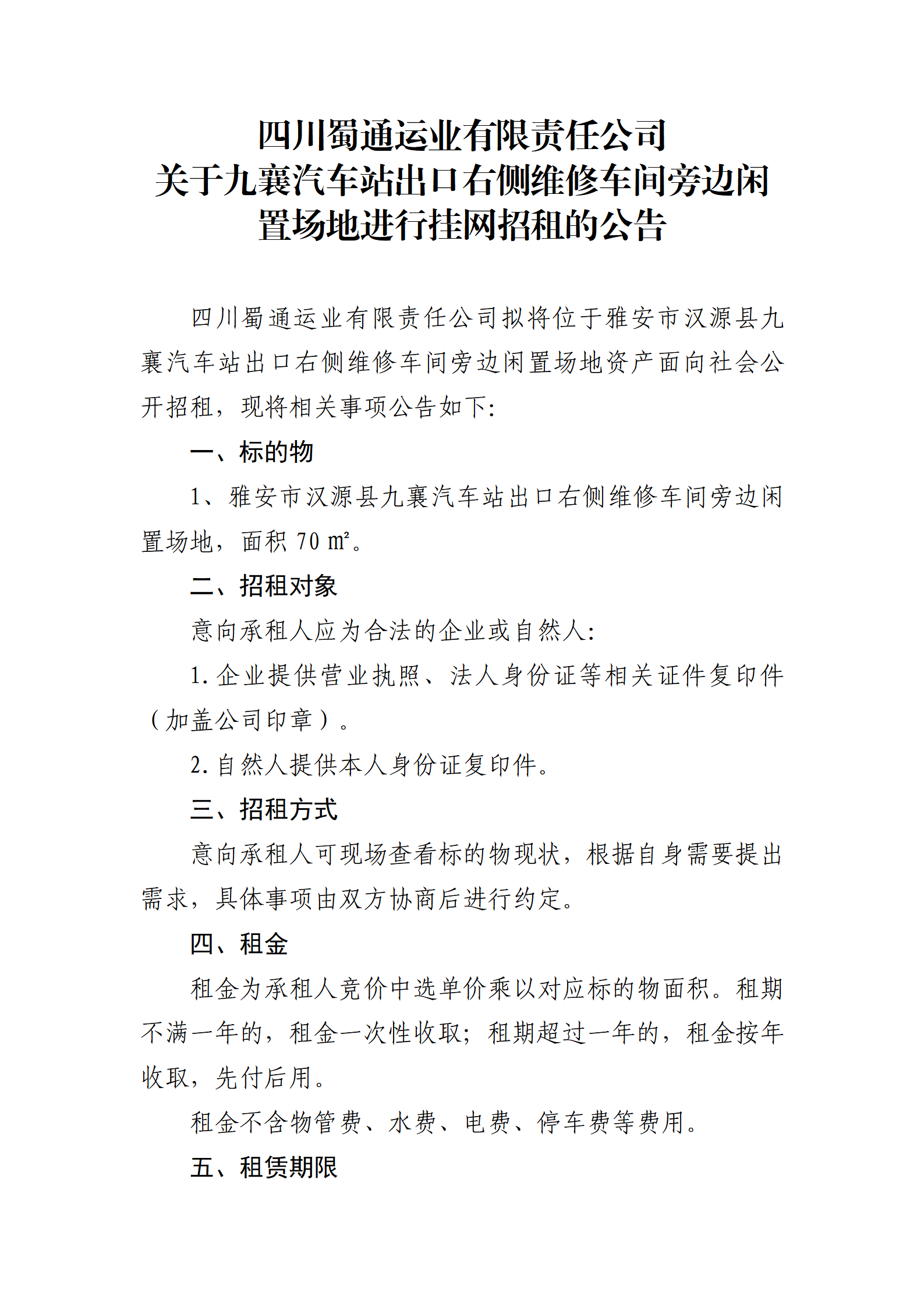 四川蜀通運業(yè)有限責任公司 關(guān)于九襄汽車站出口右側(cè)維修車間旁邊閑置場地進行掛網(wǎng)招租的公告