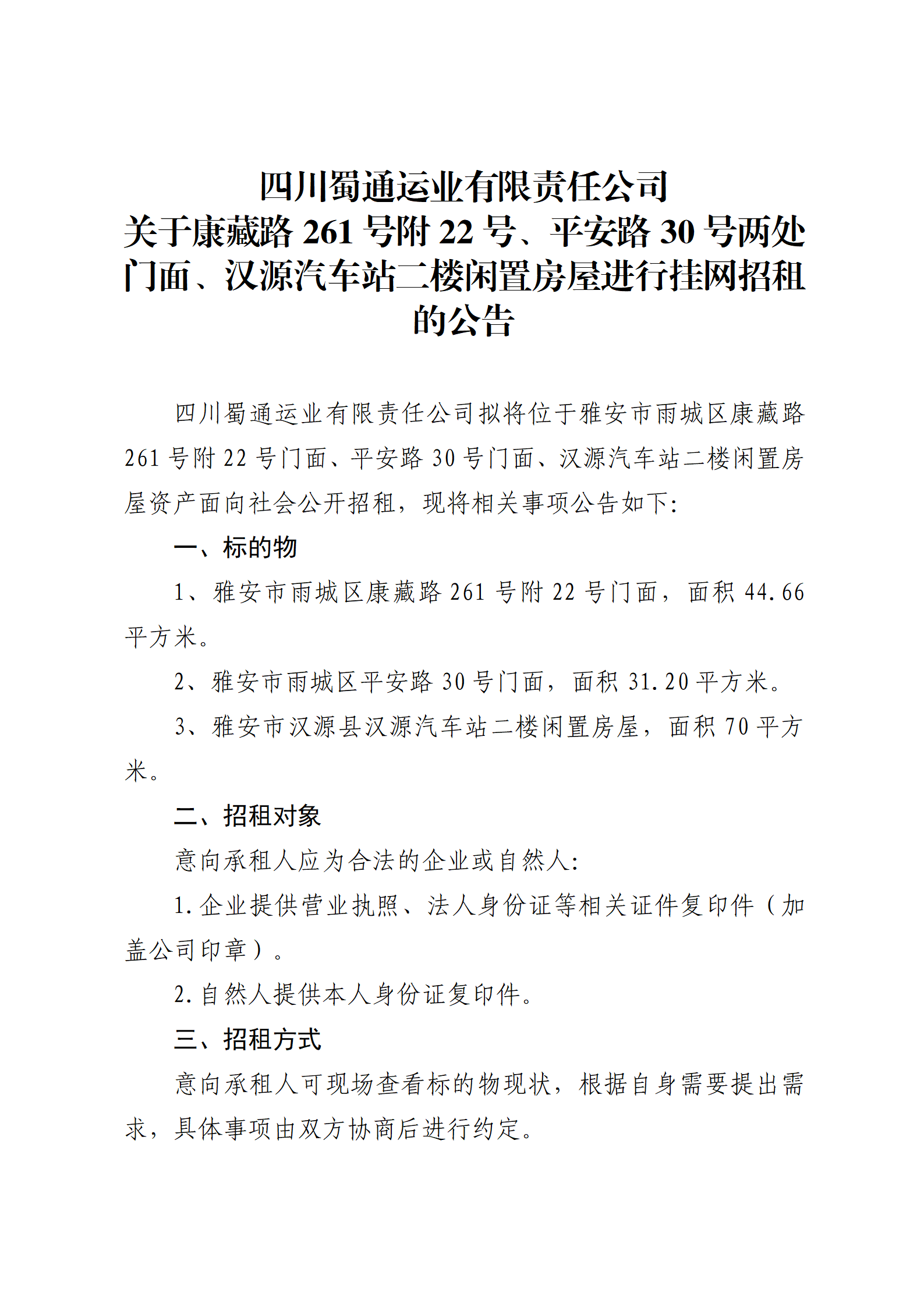 四川蜀通運業(yè)有限責任公司 關于康藏路261號附22號、平安路30號兩處門面、漢源汽車站二樓閑置房屋進行掛網(wǎng)招租的公告