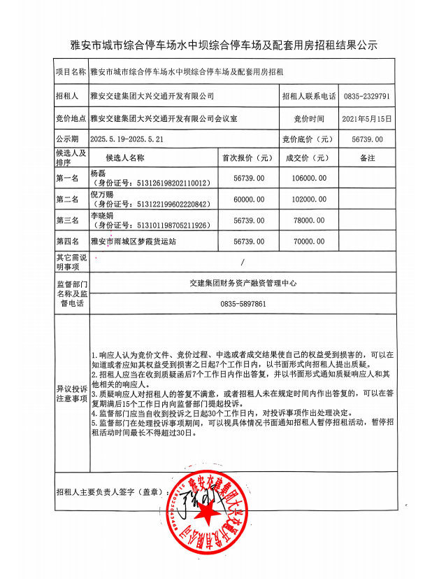 雅安市城市綜合停車(chē)場(chǎng)水中壩綜合停車(chē)場(chǎng)及配套用房招租結(jié)果公示