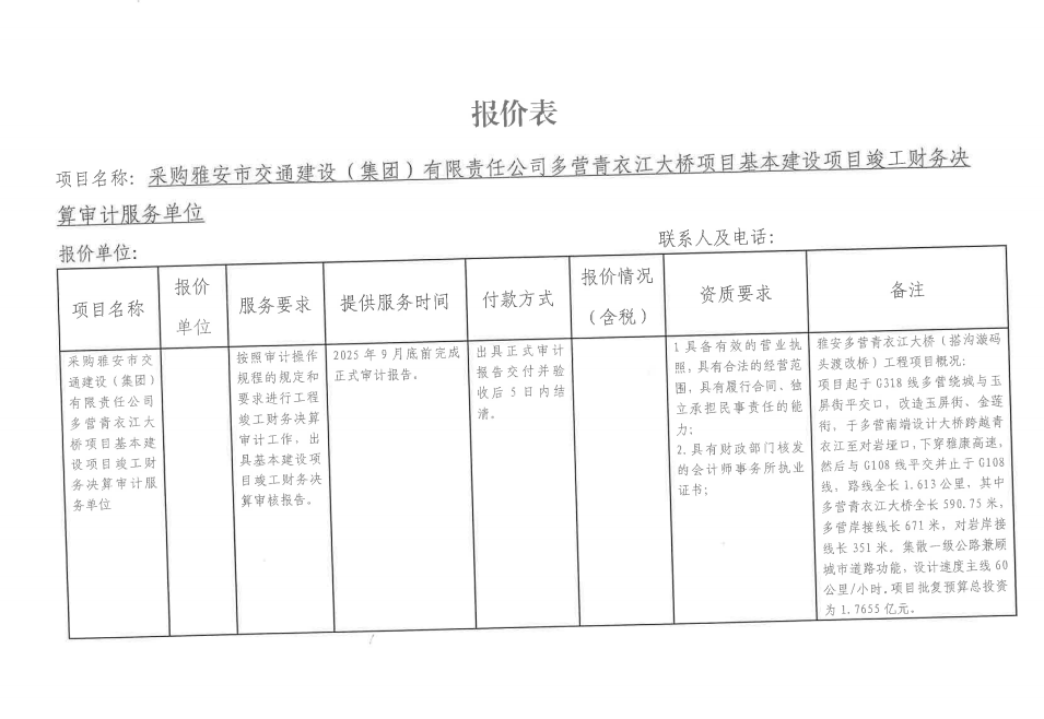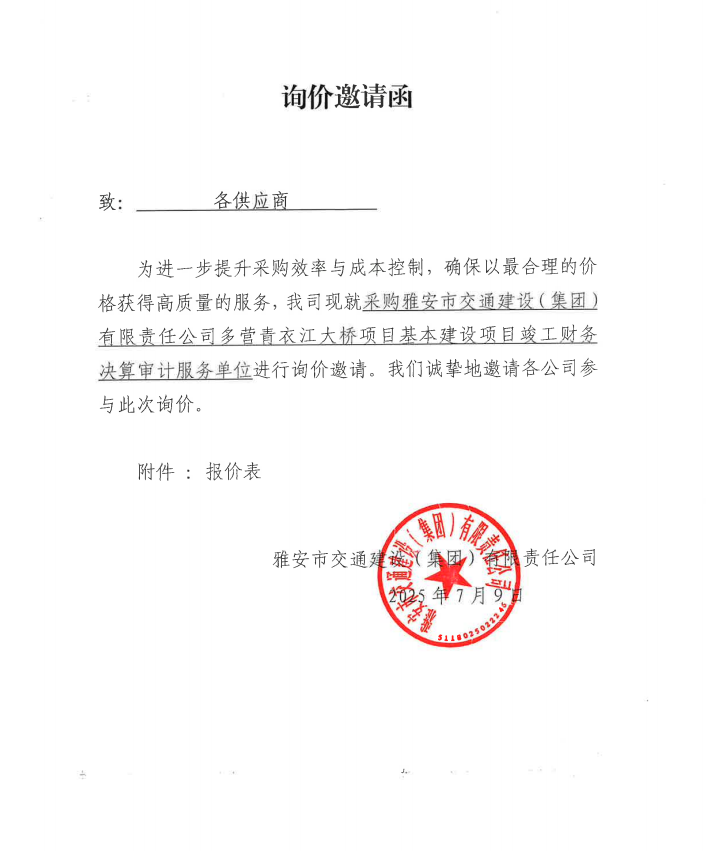 詢價(jià)邀請函——采購雅安市交通建設(shè)(集團(tuán))有限責(zé)任公司多營青衣江大橋項(xiàng)目基本建設(shè)項(xiàng)目竣工財(cái)務(wù)決算審計(jì)服務(wù)單位