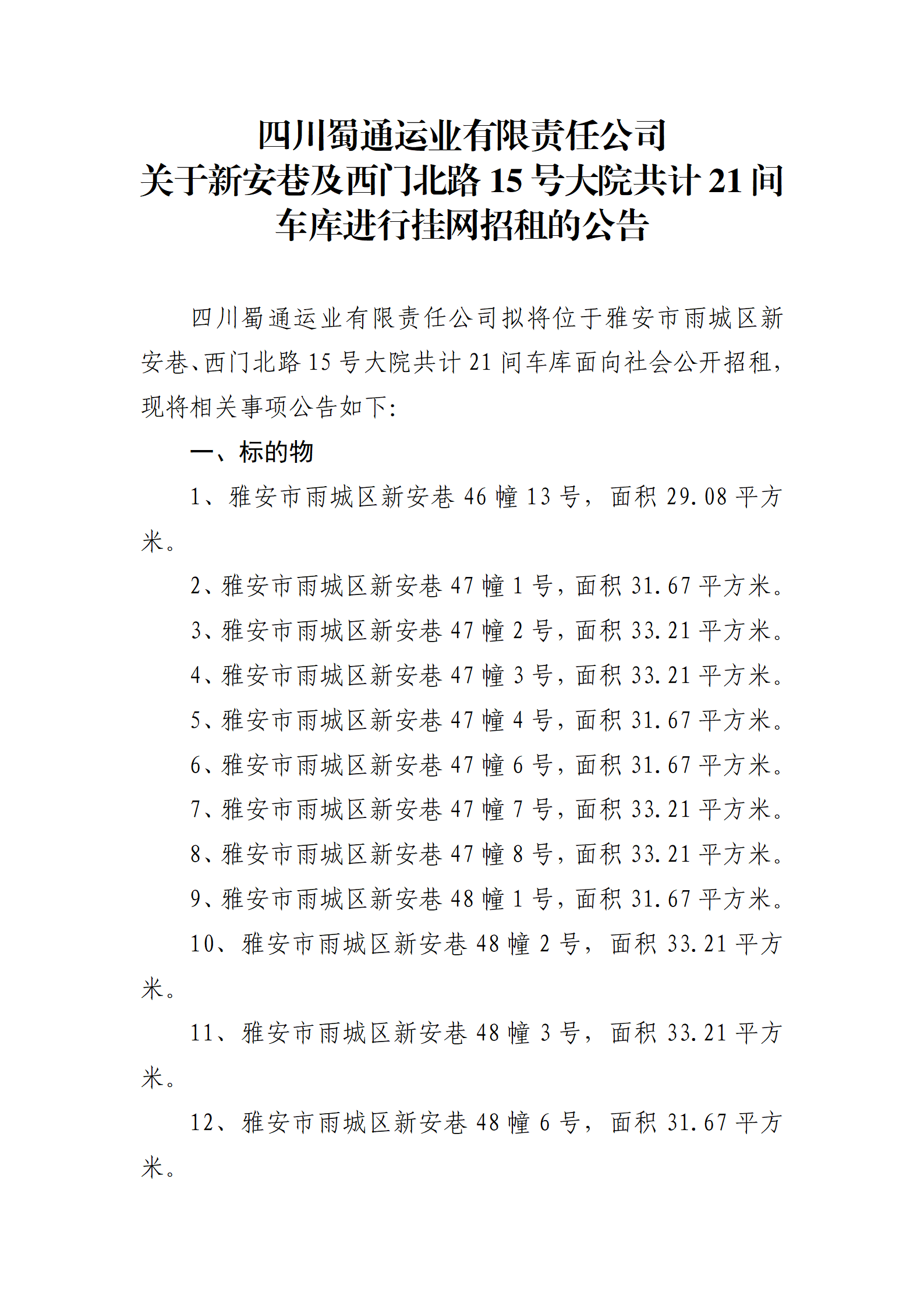 四川蜀通運業(yè)有限責(zé)任公司 關(guān)于新安巷及西門北路15號大院共計21間車庫進(jìn)行掛網(wǎng)招租的公告