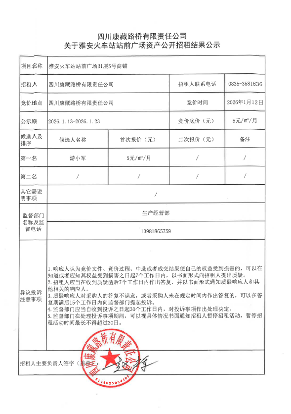 四川康藏路橋有限責任公司關于雅安火車站站前廣場資產(chǎn)公開招租結(jié)果公示