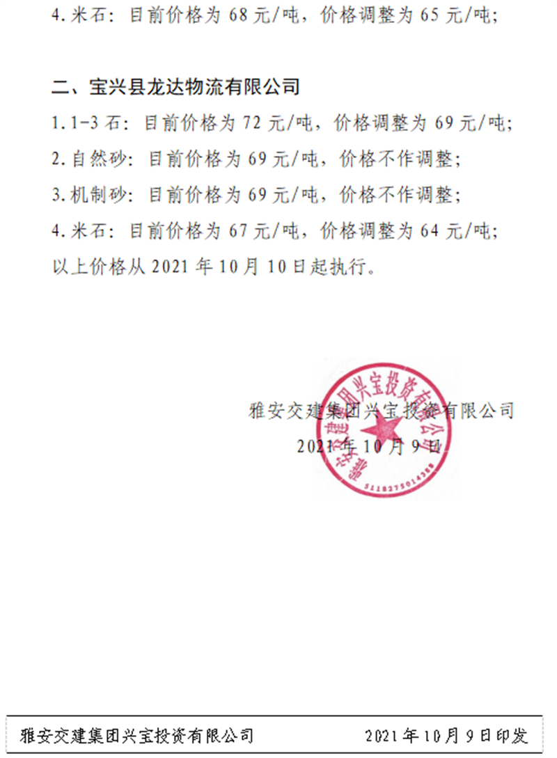 雅安交建集團(tuán)興寶公司關(guān)于調(diào)整成品料銷售價(jià)格的通知(2021.10.9)