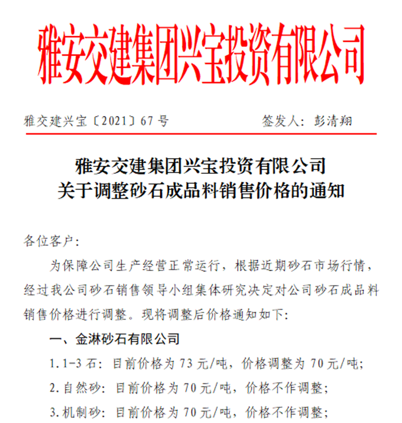 雅安交建集團(tuán)興寶公司關(guān)于調(diào)整砂石成品料銷售價(jià)格的通知(2021.9.28)