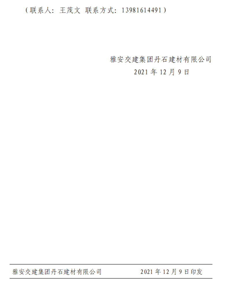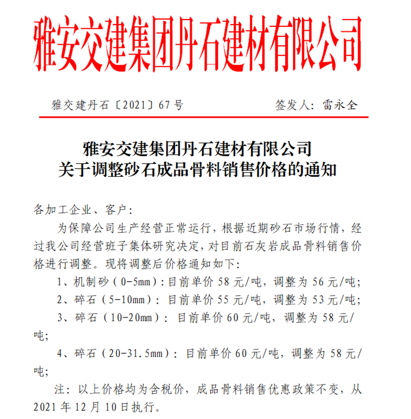 雅安交建集團(tuán)丹石公司關(guān)于調(diào)整砂石成品骨料銷售價(jià)格的通知(2021.12.9)