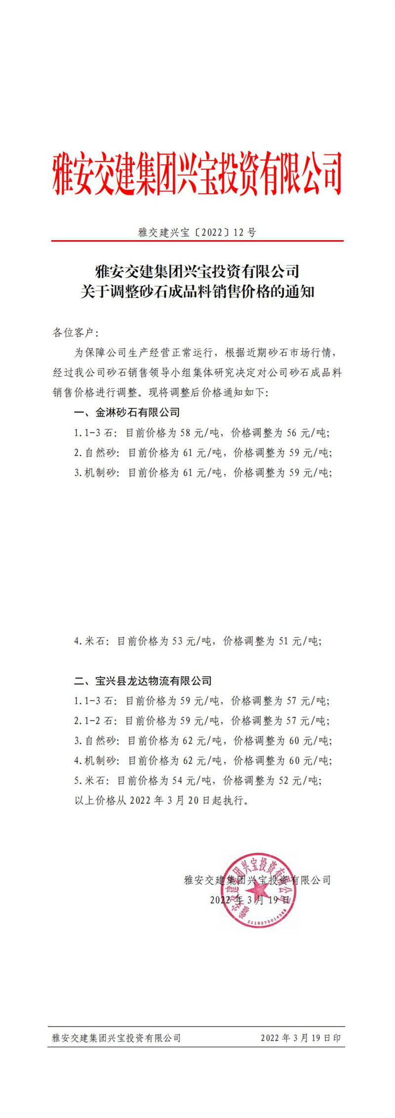 ÑŰ²½»½¨ÅdŒš¹«Ë¾êP(gu¨¡n)ÓÚÕ{(di¨¤o)Õûɰʯ³ÉÆ·ÁÏäNÊÛƒr¸ñµÄ֪ͨ£¨2022-3-1£©