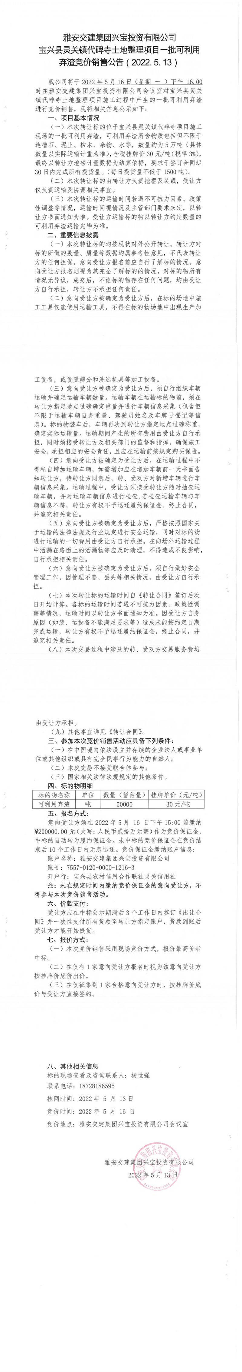 雅安交建集團興寶投資有限公司寶興縣靈關(guān)鎮(zhèn)代碑寺土地整理項目一批可利用棄渣竟價銷售公告(2022.5.13)