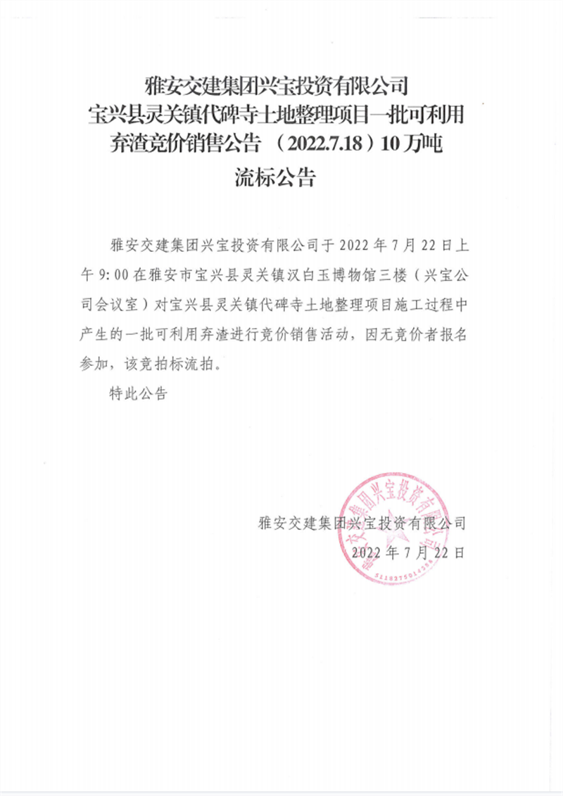 興寶公司寶興縣靈關(guān)鎮(zhèn)代碑寺土地整理項(xiàng)目10萬(wàn)噸可利用棄渣競(jìng)價(jià)銷售掛網(wǎng)公告7.22(10萬(wàn)噸)