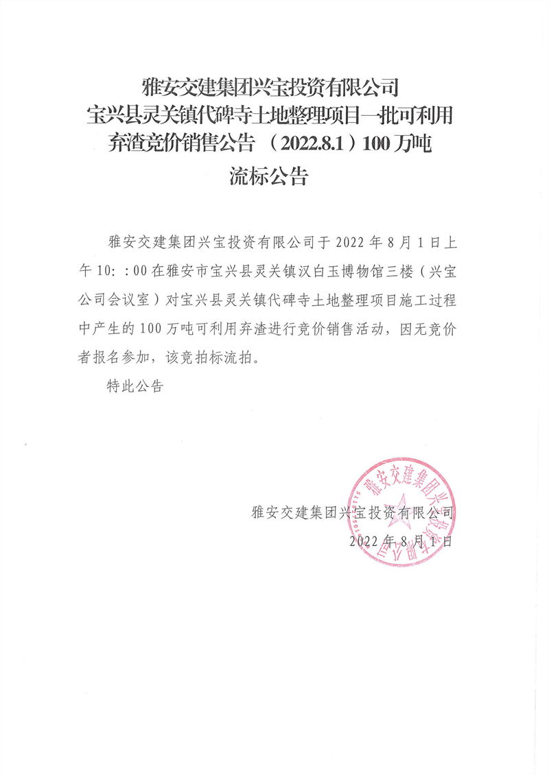 雅安交建集團(tuán)興寶投資有限公司靈關(guān)鎮(zhèn)代碑寺土地整理項(xiàng)目100萬噸可利用棄渣競價銷售流標(biāo)公告(2022.8.1)