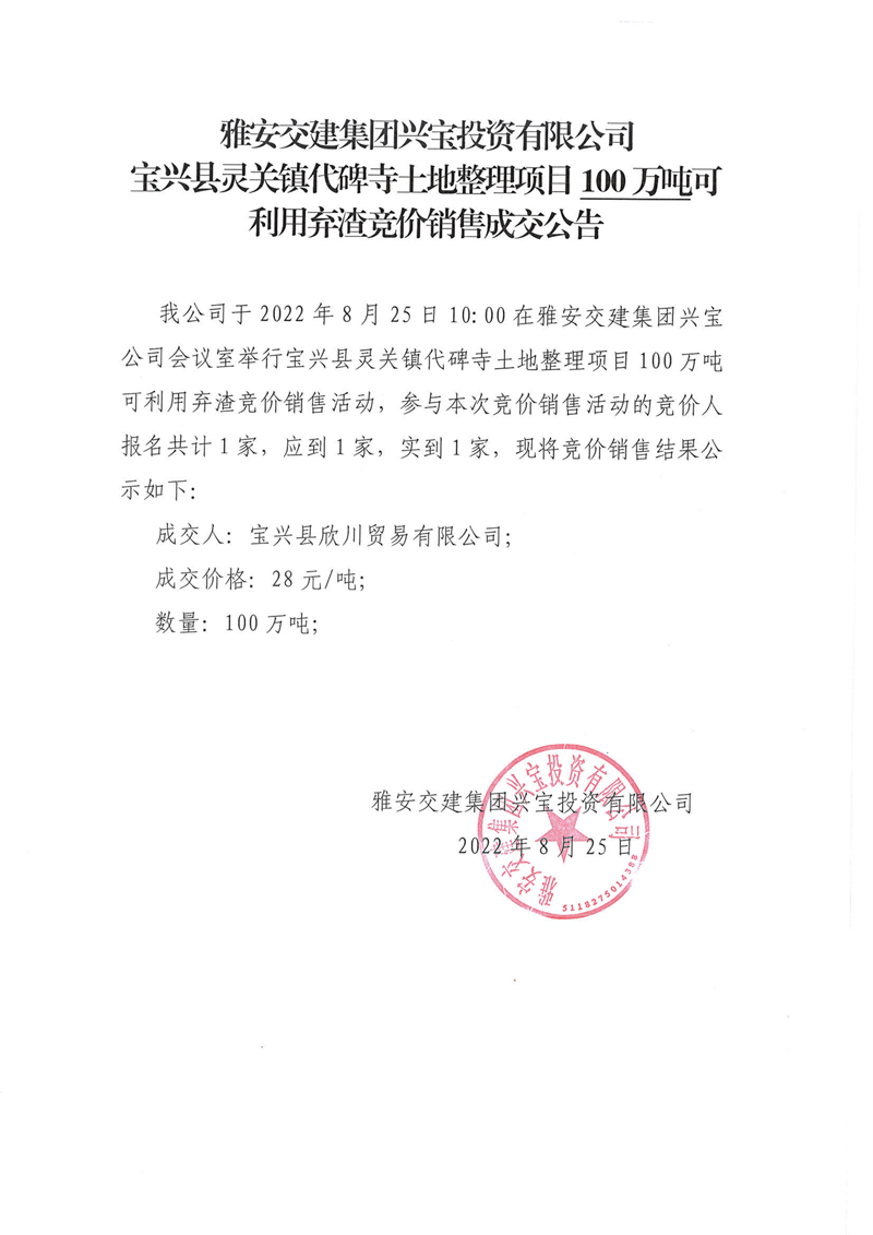 雅安交建集團(tuán)興寶投資有限公司寶興縣靈關(guān)鎮(zhèn)代碑寺土地整理項(xiàng)目5萬噸可利用棄渣競(jìng)價(jià)銷售成交公告(8.23)