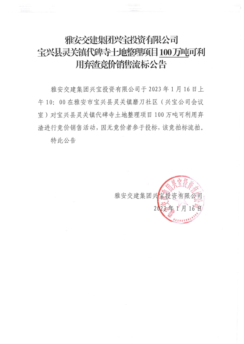 雅安交建集團(tuán)興寶投資有限公司100萬噸可利用棄渣競價(jià)銷售流標(biāo)公告(2023.1.16)