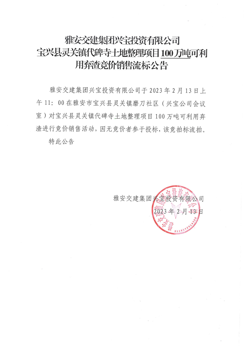 雅安交建集團興寶投資有限公司100萬噸可利用棄渣競價銷售流標(biāo)公告(2023.2.13)