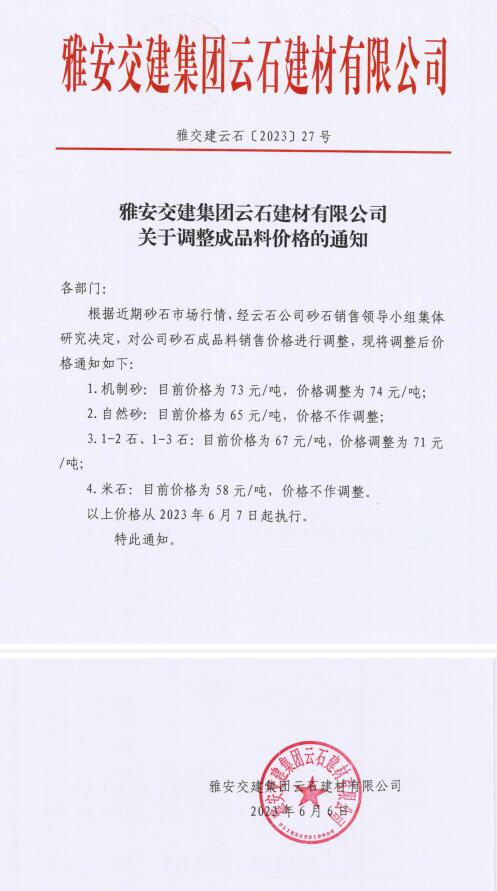 雅安交建集團云石建材有限公司成品料價格調整公告(2023-06-06)