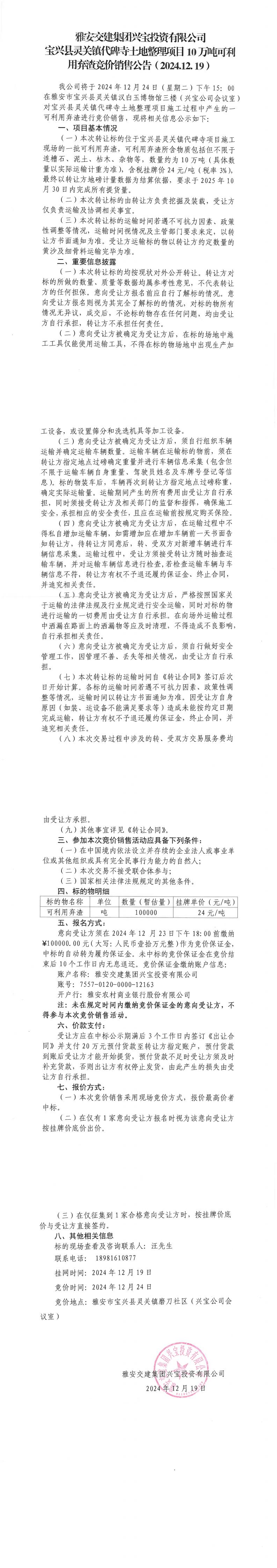 雅安交建集團(tuán)興寶投資有限公司靈關(guān)鎮(zhèn)代碑寺土地整理項目10萬噸可利用棄渣競價銷售公告(2024.12.19)