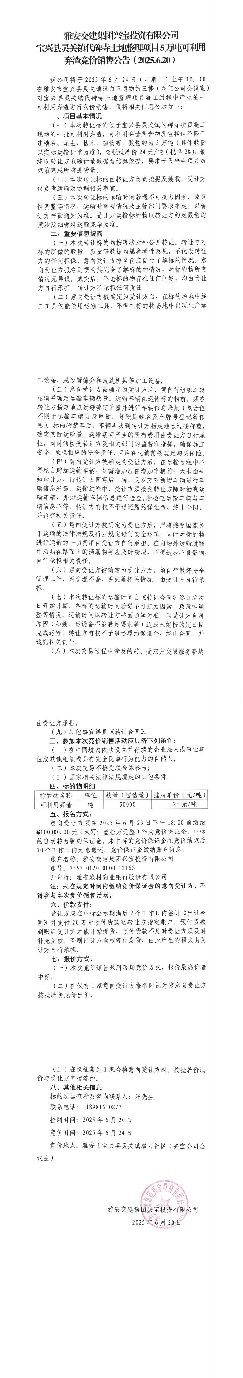 雅安交建集團(tuán)興寶投資有限公司寶興縣靈關(guān)鎮(zhèn)代碑寺土地整理項目5萬噸可利用棄渣競價銷售公告